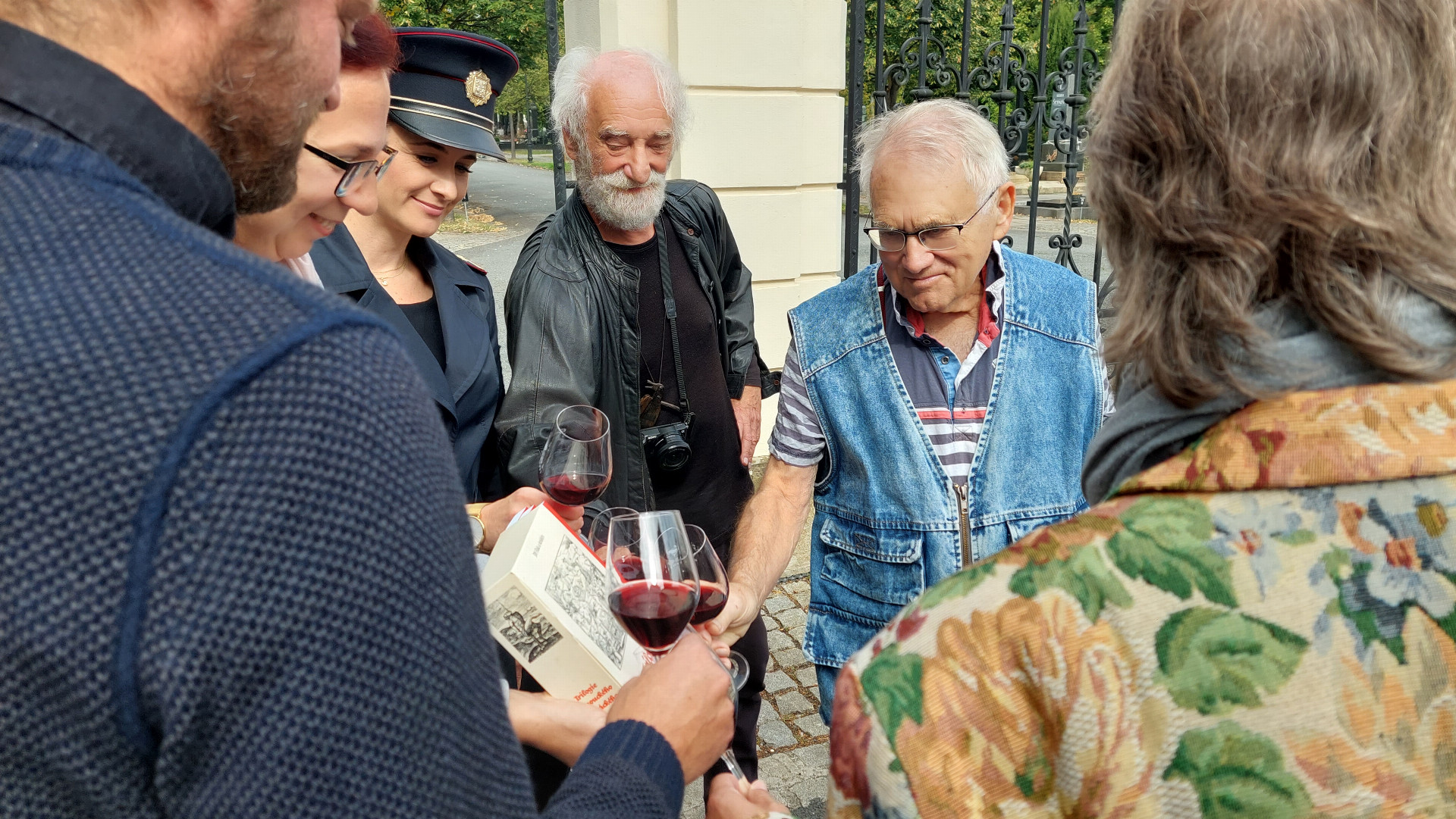 Závěrem pětice kmotrů připila na šťastnou cestu Trilogie ke čtenářům, a to tematicky francouzským červeným vínem V.I.T.R.I.O.L., věnovaným olomouckou vinotékou Galský kohout.