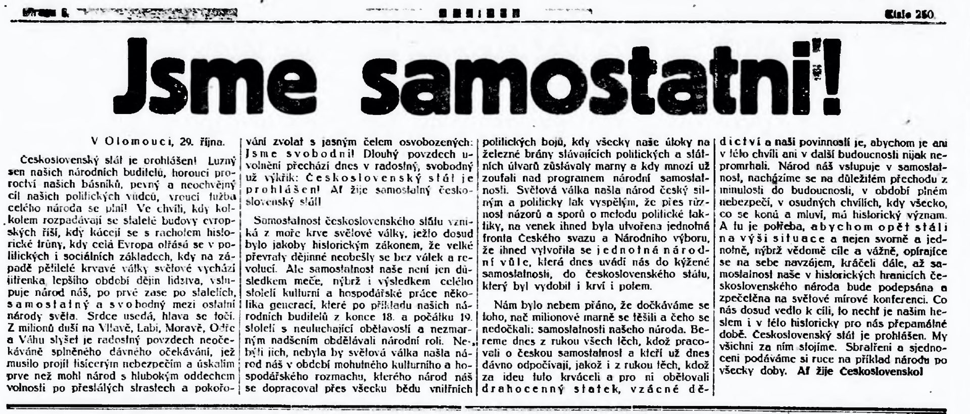 Jedním z takových aktů bylo vyhlášení státu Německé Rakousko (Republik Deutsch-Österreich), k němuž došlo 21. října 1918. Nárokovaný stát měl však podle představ svých duchovních otců zahrnovat i území Deutschböhmen, tedy Německých Čech s hlavním městem Libercem. K souvislému území Sudet měly být přidány i enklávy s převahou německého obyvatelstva a k těmto ostrovům v českém živlu měla patřit i Olomouc. Dějiny se však v následujících dnech vydaly jiným směrem. V Praze došlo dne 28. října za známých okolností a prostřednictvím proslulých aktérů, kteří později díky tomuto dějinnému angažmá získali přídomek „muži 28. října“ (Alois Rašín, František Soukup, Jiří Stříbrný, Antonín Švehla a Vavro Šrobár), k vyhlášení Československé republiky. Ovšem v tomto článku se nevracíme k době, v níž by se informace šířily veřejným rádiem, televizí či internetem. K úspěchu revoluční akce bylo potřeba, aby se k novému státu přihlásili i místní obyvatelé na celém území, které si nárokoval. Organizační role tohoto procesu se ujaly místní pobočky národního výboru, který měl své lidi i v Olomouci. Okresní národní výbor zde byl ustaven 26. října. Jak se však do Olomouce dostala informace o pražských událostech a co se dělo v následujících hodinách? Historik prof. Jiří Fiala nedávno zveřejnil autentické vzpomínky tehdejšího předsedy olomouckého okresního národního výboru Richarda Fischera, advokáta a pozdějšího dlouholetého starosty Olomouce. Ty popisují hodiny, kdy zpráva o vzniku republiky doputovala do Olomouce, a dění, které vyvolala velmi živě a autenticky: