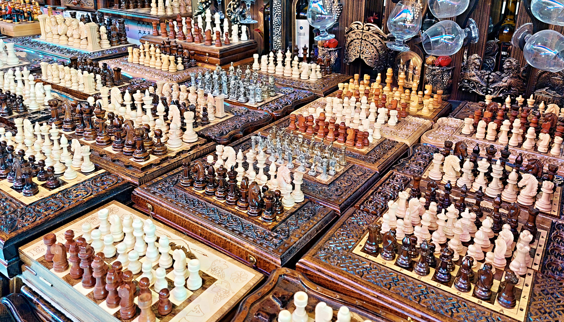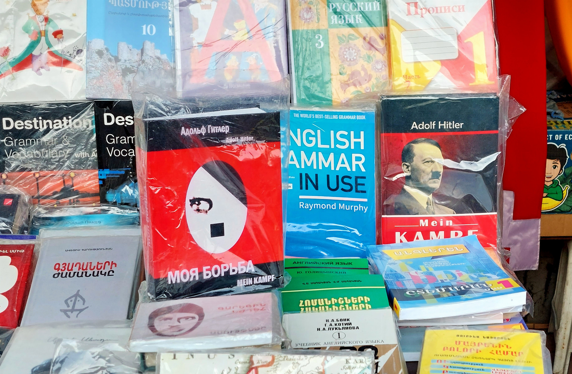 A jaký je zde sortiment? Seženete vše, od pestrých koberců, šachových sad v desítkách verzí přes tradiční turistické tretky, obrazy s nezbytným panoramatem hory Ararat, hrnce a džezvy až po staré osobní doklady a vedle sebe svorně ležící vojenská vyznamenání z dob Sovětského svazu i třetí říše. Tuhle směsici korunuje hrdě vystavené rusko-německé vydání Hitlerova díla Mein Kampf, v ruštině Maja barba.