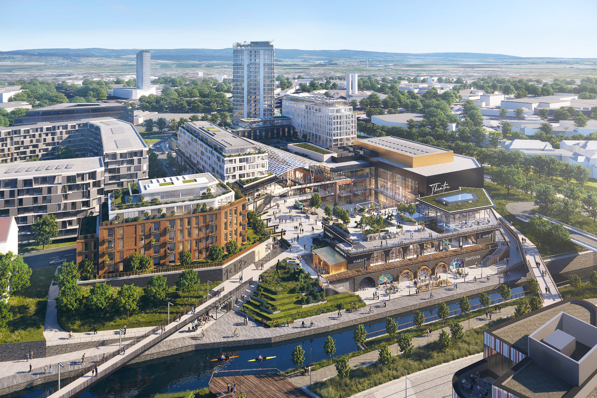 Pozornost veřejnosti dál přitahuje prostor u Galerie Šantovka, kde na levém břehu Mlýnského potoka developerská skupina Redstone podnikatele Richarda Morávka letos zahájí stavbu společensko-zábavního centra Šantovka District. Vznikne zde komplex budov s otevřenými fasádami a centrální zastřešenou ulicí i nová veřejná prostranství včetně revitalizovaného nábřeží. Součástí projektu je i multifunkční sál, obchody, služby a kanceláře, v podzemí se počítá s kapacitním parkováním. Mezi „taháky“ projektu pak figuruje čtyřhvězdičkový hotel AC Hotels by Marriott. Start výstavby je plánovaný na rok 2026, stavba potrvá minimálně dva roky.