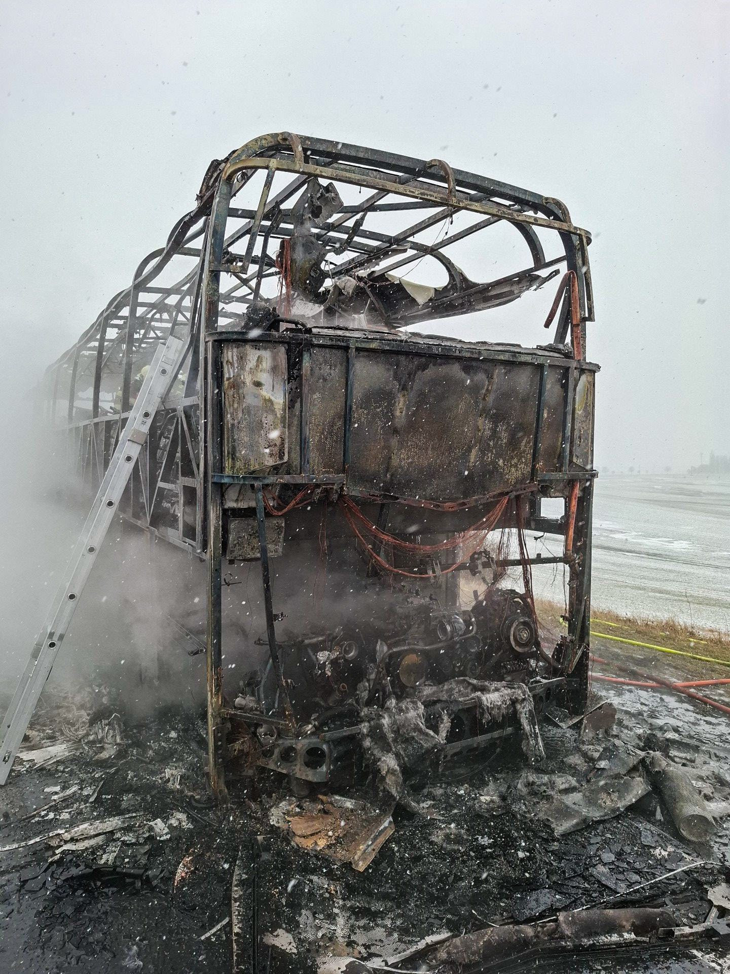 Velký požár dálkového autobusu likvidují hasiči na dálnici D46 u Vranovic-Kelčic ve směru na Vyškov. Na dálnici byl kvůli tomu ve směru na Brno dočasně zastaven provoz. Evakuovaní lidí čekají na odvoz.