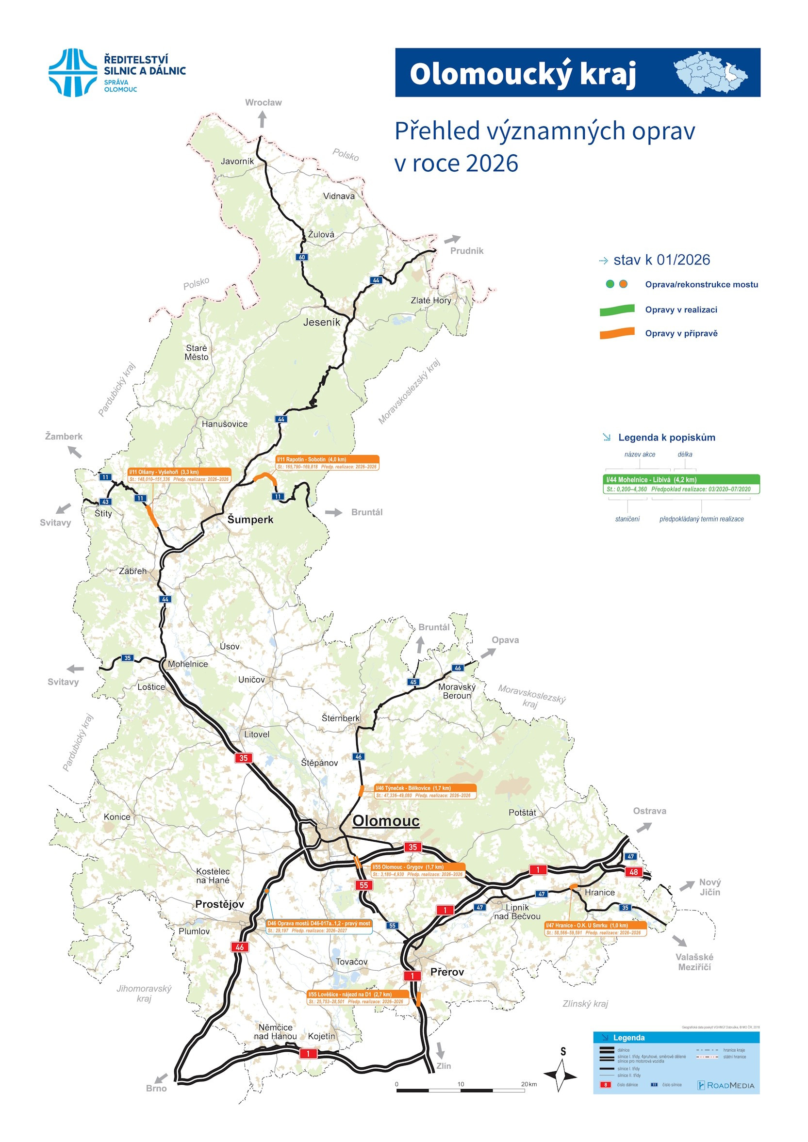 Podle zveřejněného přehledu ŘSD se má letos opravovat zhruba 1,7 kilometru dlouhý úsek silnice I/46, která zajišťuje hlavní spojení Olomouce se Šternberkem a dále s Jesenickem. Přesný termín zahájení prací ani dopravní režim v době opravy ale zatím ŘSD nezveřejnilo. Jisté je pouze to, že se opravy uskuteční během letošní stavební sezony.