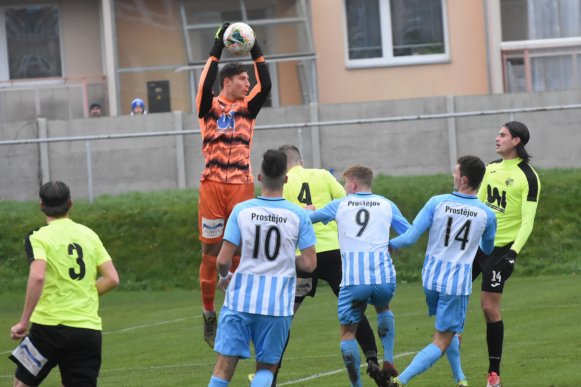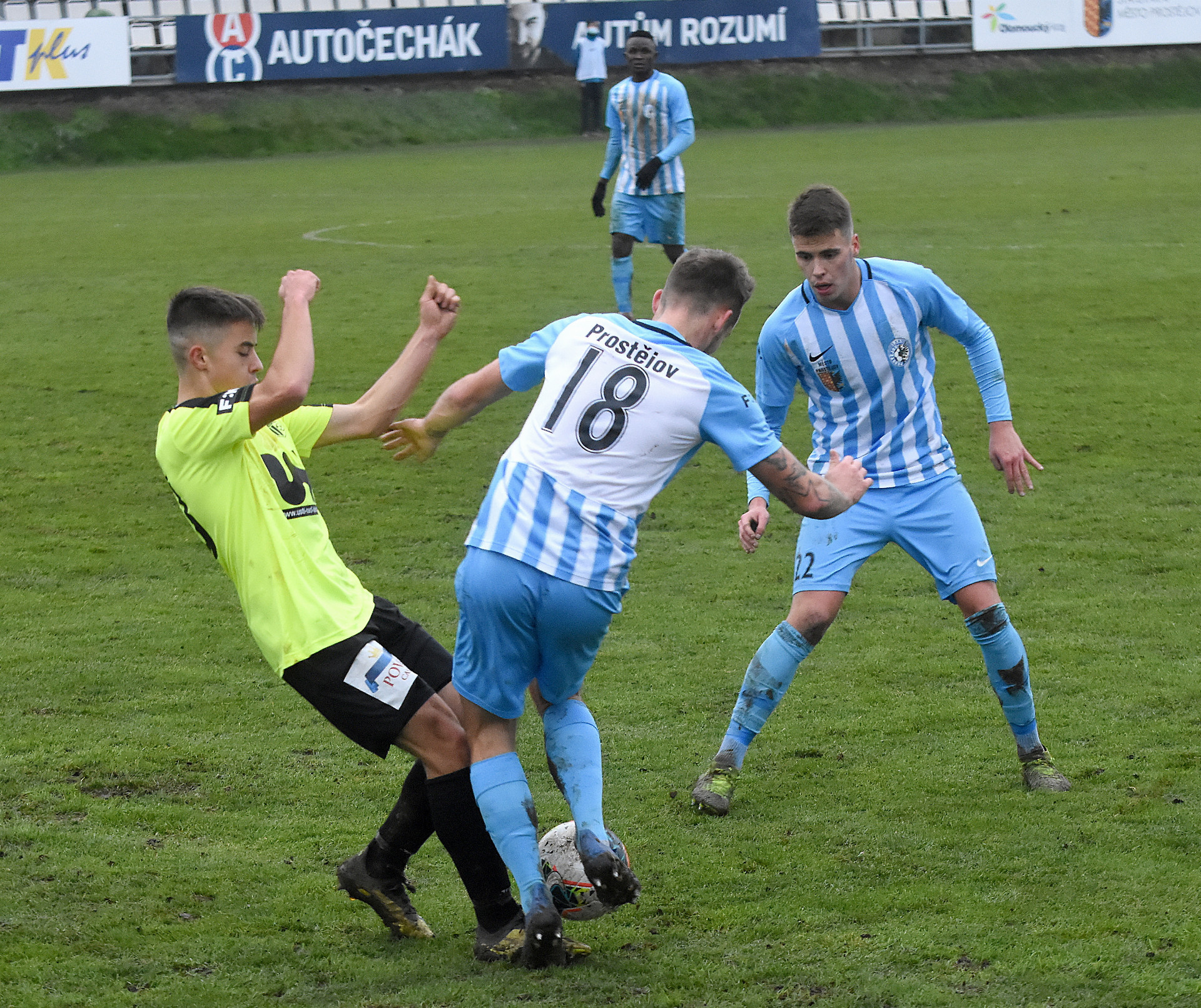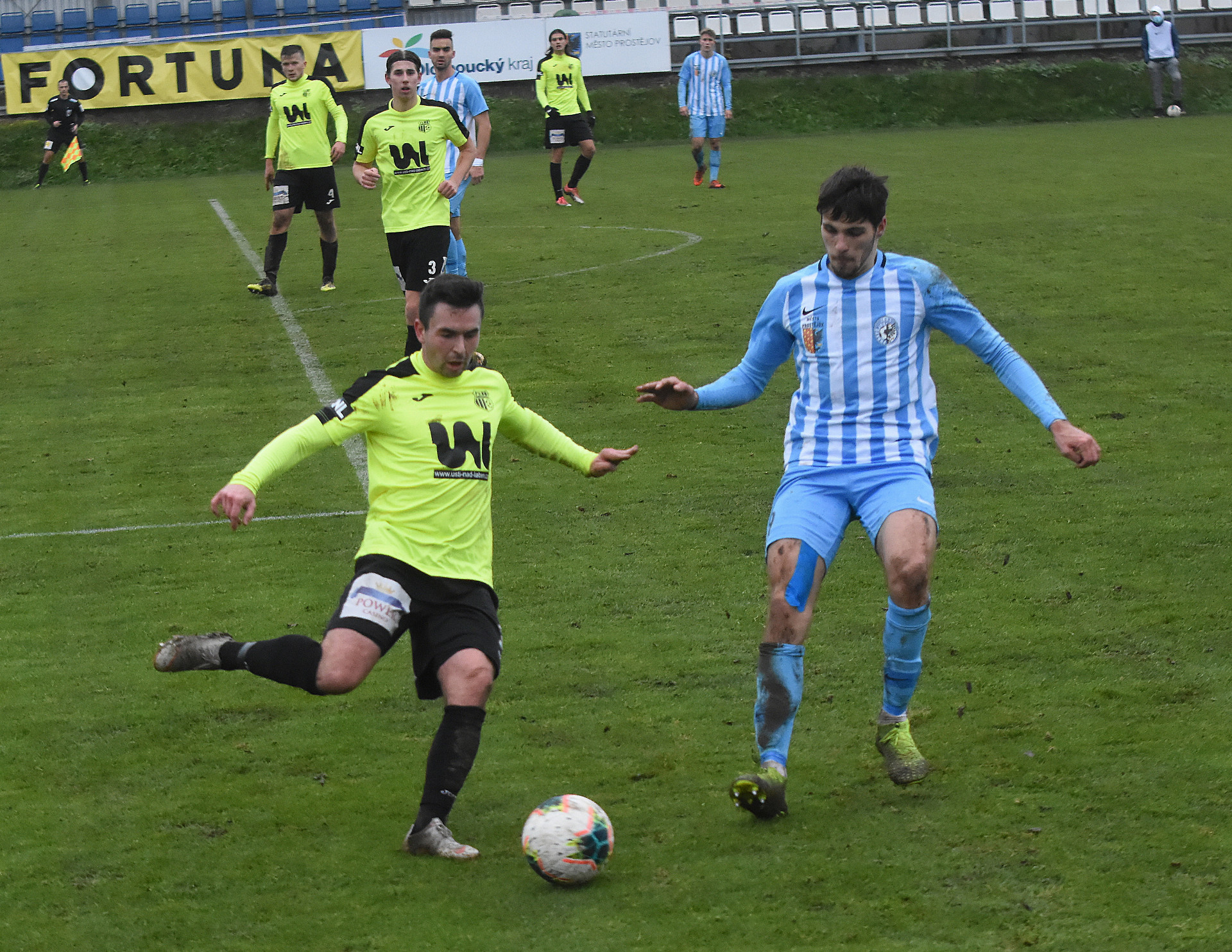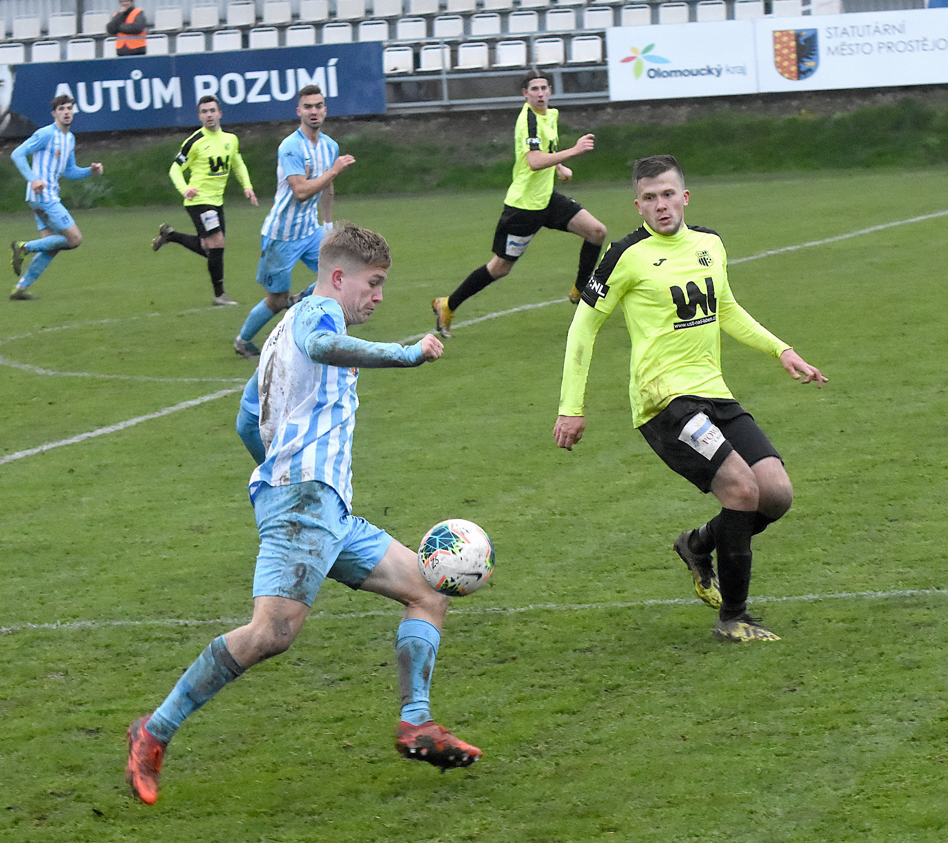 Na těžkém terénu se hrál dlouho vyrovnaný duel bez větších šancí. Ale nebezpečnější pak byli domácí. V závěru poločasu ale neproměnili vyložené šance, tu největší měl Zikl. Podobné to bylo i po přestávce, to měl zase velkou šanci Zikl. Ale brankář Tvrdoň zkazil Prostějovu radost. Byl to zlomový moment utkání, chvíli poté šli totiž hosté do vedení z docela přísně nařízené penalty. Srovnat mohl nebezpečný Zikl, nejprve mu brankář další tutovku vyrazil znovu na roh, pak z malého vápna minul.