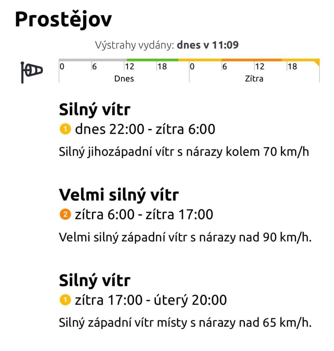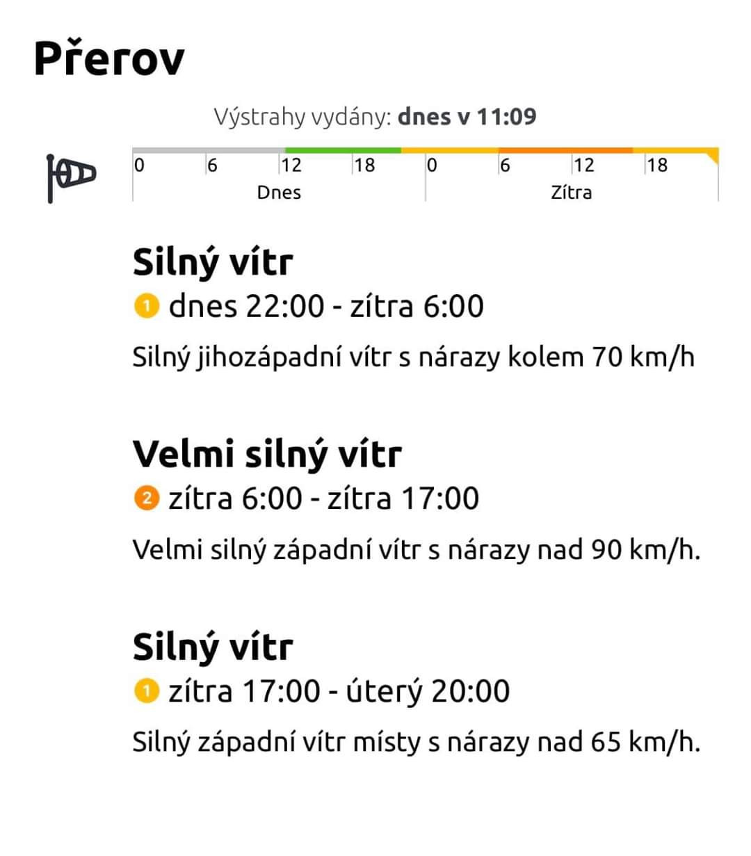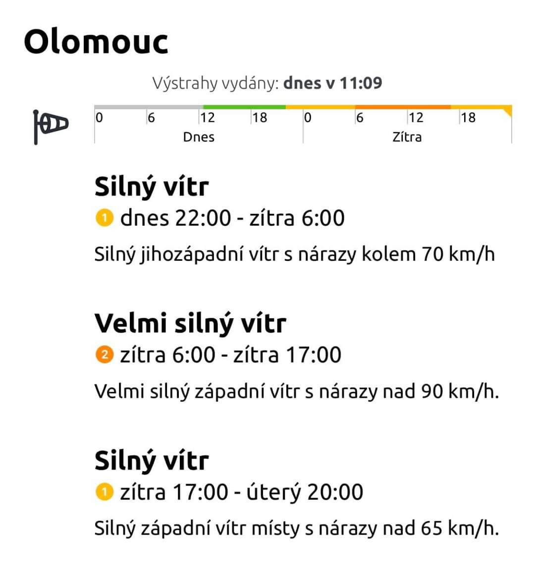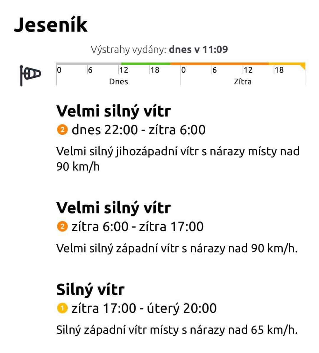 Upozornění na velmi silný vítr platí do úterního večera. Meteorologové lidem radí, aby sledovali aktuální situaci, zajistili okna a dveře, odstranili, případně upevnili volně uložené předměty a omezili pohyb venku i jízdu autem. Na horách mají omezit vycházení, nevydávat se na túry a respektovat pokyny horské služby.
