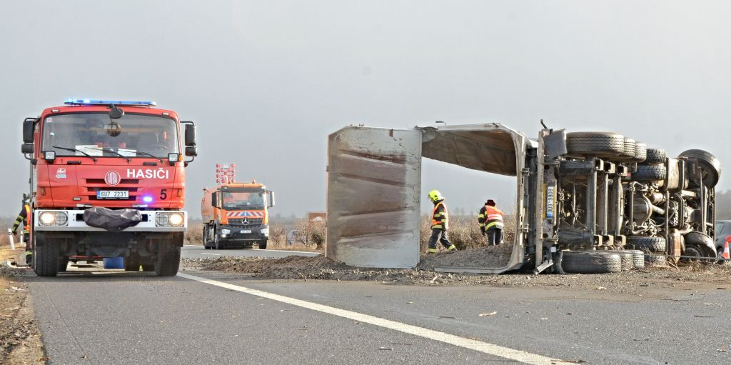 Tři hasičské jednotky zasahovaly u dopravní nehody na 34 kilometru dálnice D8 u Doksan. Jednalo se o převržený kamion a následné vysypání převáženého stavebního štěrku, který poškodil další kamion.